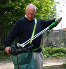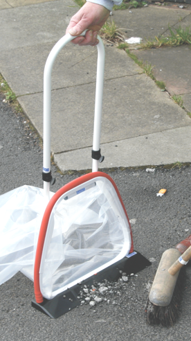 B06DS11E uses is the same 06 heavy duty version of the above frame but with the addition of an external handle thus eliminating the need to stoop and being of particular benefit for use in crowded urban environments. It can be carried on the shoulder if fitted with an impermeable bag, shown here fitted with a 500g. clear bag. Minimum sack neck width is 600mm. Bag change should take about 40 seconds.