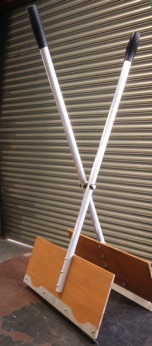 Ash wood handles with brass bushes and stainless pivot bolt, marine plywood compaction boards + stainless scraper plates. Overall height 96cm. Weight 2.8kg. 4-off in production Jan. 2026.